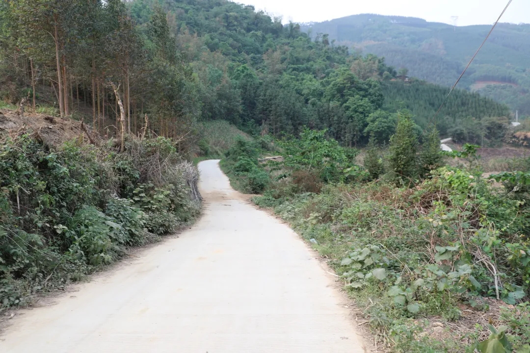 我們去弄當的路上, 就看到路邊堆放了許多已捆好的甘蔗, 有的正在裝車, 山間上還久不久露出綠道鐵皮的棚子,龔道萬告訴我們那就是林下養(yǎng)雞的雞舍, 2018年初我們去弄當村還是泥濘的道路換成了水泥路……